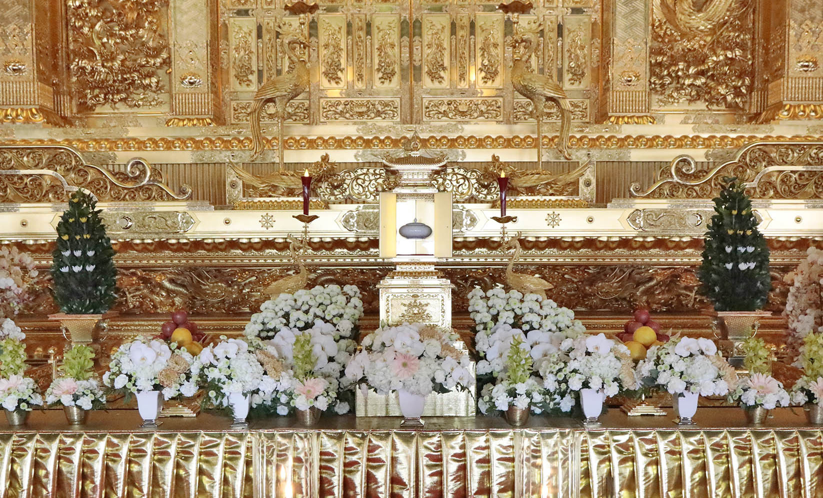 「佛教之王堂」本堂 宮殿前に設えられ 美しい花々によって荘厳された