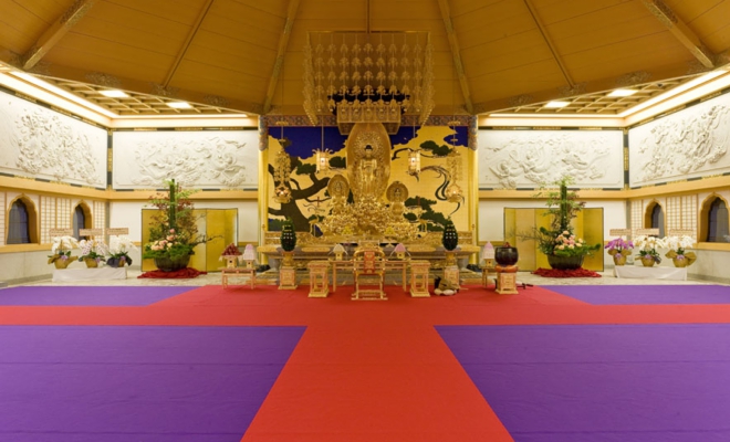舎利殿福建省工芸美術大師 黄文寿仏師制作による 高さ4.15m の阿弥陀三尊仏像周囲を囲む 総延長62.2m 高さ2.25m(11 枚)の石仏・飛天欄間彫刻群は中国工芸美術大師(人間国宝)作また 内部は13,000 点に及ぶ彫金金具で荘厳されています
