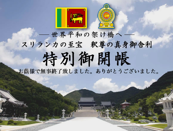 特別御開帳の期間中、スリランカ首相閣下も御参詣になり、閉会式にも参列されました。日本国外務省、警察庁、文化庁、兵庫県及び地元加東市並びに近隣自治区の皆様や、兵庫県警本部、社警察署、生田警察署、大阪府警本部、関空警察署はじめ関係諸官庁のご協力のお蔭をもちまして、無事終えることができましたことを、本ホームページをお借りして、スリランカ政府より、心から厚く御礼申し上げます。