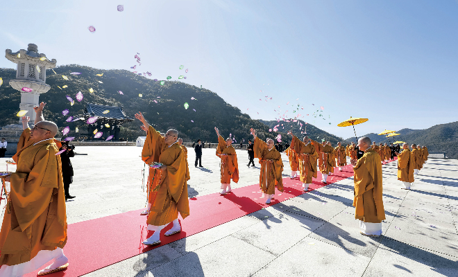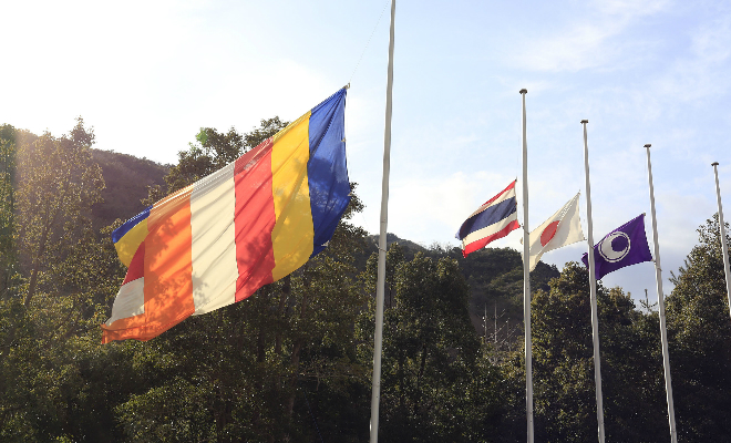 念佛宗の追悼大法要 各国国家元首の写真が並ぶ