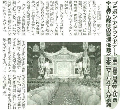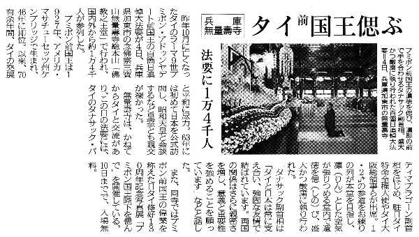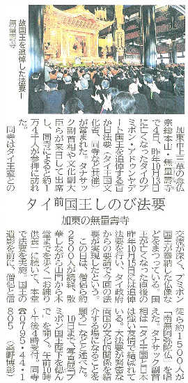 その模様は、タイ王国にて、国営テレビ並びにインターネットにより、王国全土に大々的に報道され日本においては、毎日新聞、神戸新聞、ジャパンタイムズを始め、全国各紙に報道されましたので、その一部を紹介いたします。