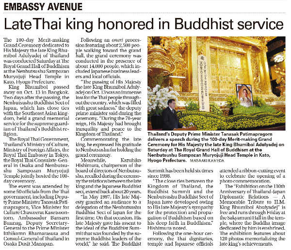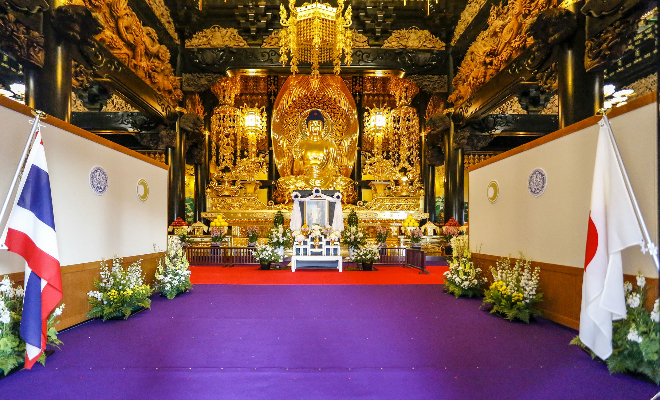 タイ王国文化省、タイ王国外務省、在京タイ王国大使館、タイ王国大阪総領事館、念佛宗三寶山無量壽寺の共催により営まれました『タイ国王陛下崩御 百箇日追悼大法要』および『日タイ修好130周年記念写真展』が厳粛かつ盛大に執り行われ、無事閉幕いたしました。